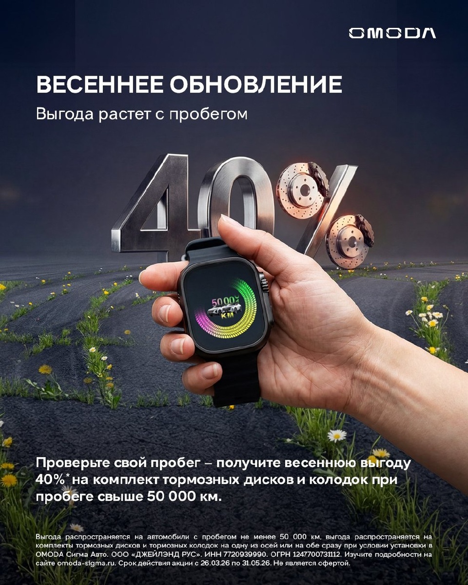 ! ✨ Пришло время подготовить автомобиль к новым маршрутам. Мы запускаем акцию «Весеннее обновление». До 31 мая комплект тормозных дисков и колодок можно приобрести с выгодой 40%! 💡Условия участия: • Пробег автомобиля от 50 000 км; • Покупка комплекта дисков и колодок (на одну ось или обе); • Установка в сервисном центре OMODA Сигма Авто. Проверьте пробег, обновите тормоза и встречайте сезон уверенно. Подробности акции уточняйте в отделе сервиса OMODA Сигма Авто. - - - - - - - - - - - - - - - - - - OMODA СИГМА АВТО 🚩Большой пр. В.О., 98 📱+7 (812) 614-12-40 🌐 https://sale.sigma-omoda.ru