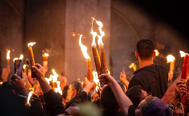 Благодатный огонь — святыня, которая ежегодно сходит в Великую субботу в храме Гроба Господня в Иерусалиме накануне Пасхи. Для христиан это особое знамение, связанное с Воскресением Христовым и духовным обновлением человека. Схождение огня происходит в Кувуклии — часовне, возведенной над Гробом Господним. Перед началом богослужения ее тщательно проверяют, чтобы исключить наличие любых источников огня. После этого Патриарх Иерусалимский входит внутрь с молитвой, и спустя некоторое время выносит зажженные свечи, от которых зажигают огонь тысячи верующих. Среди особенностей Благодатного огня верующие отмечают, что в первые минуты он не обжигает — люди умываются им, проводят по лицу и рукам. Затем пламя приобретает обычные свойства. Это явление ежегодно засвидетельствовано тысячами паломников и воспринимается как часть чуда. После схождения огонь быстро распространяется по храму, а затем его доставляют в разные страны. В Россию святыню привозят к Пасхальному богослужению, где от нее заж