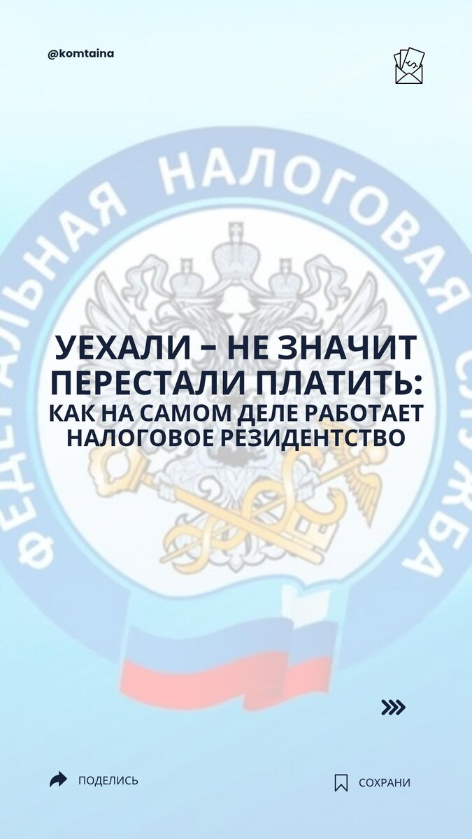 Многие предприниматели, переехавшие за границу, исходят из простой логики: если провел за пределами России больше полугода, значит статус изменился, обязательства исчезли. Налоги теперь там, где живешь. Именно в этой точке возникает самая дорогая ошибка. Налоговое резидентство - это не формальный факт пересечения границы, а юридический статус с конкретными критериями. Он не исчезает сам по себе и продолжает действовать до тех пор, пока не оформлен правильно. Цена ошибки - доначисления за несколько лет, пени и штрафы. Налоговое резидентство не меняется автоматически. Это статус, который требует осознанных действий и документального оформления. Физический переезд не равен смене налоговых обязательств. Смена налогового резидентства — это: 🔥 Риск доначислений 🤔 Сложный процесс 👍 Понятная процедура @komtaina