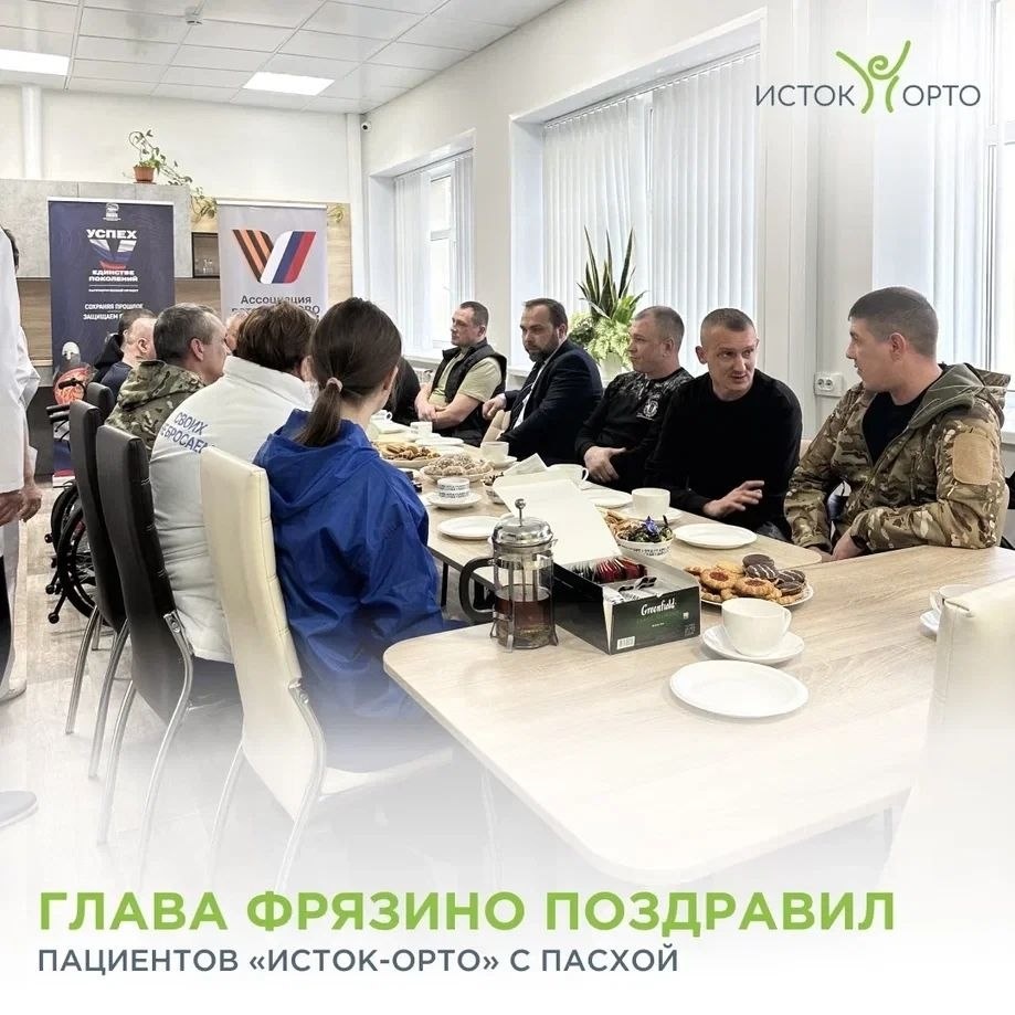 Улыбки, праздничное настроение, нарядные куличи – накануне светлого праздника Пасхи Центр «Исток-Орто» посетили почетные гости. Ветеранов СВО, находящихся у нас на реабилитации, посетили глава города Фрязино Дмитрий Воробьев, сотрудники администрации, депутаты городского Совета, представители регионального отделения ФЗО и общественных организаций. Пациентам центра привезли праздничные гостинцы – пасхальные куличи. «Приехали вас поздравить с наступающим праздником. Накрыть стол, устроить чаепитие и принести вам небольшие презенты. Этот праздник действительно светлый, сравним с Новым годом, ожиданием чуда…», – подчеркнул Дмитрий Воробьев. Сегодня в нашем центре проходят реабилитацию бойцы со всей страны: из Архангельской области, Казани, Барнаула, Алтайского края и других регионов России. Перед праздником Пасхи к некоторым из них приехали родные – жены и дети. После приветственных слов гости сели за общий стол. За чаепитием беседовали на волнующие темы, делились впечатлениями от пребыван