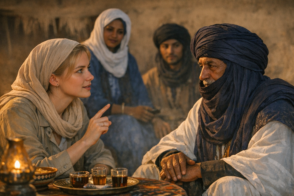 Девушки – Зизи, Жаклин и Лера – только начали накрывать на стол, расставляя потертые, но чистые кружки и блюдца с причудливым восточным узором, когда в помещение зашел факих Идрис с двумя молодыми мужчинами. Они появились бесшумно, как тени, – только лёгкий скрип песка под подошвами выдал их приближение.