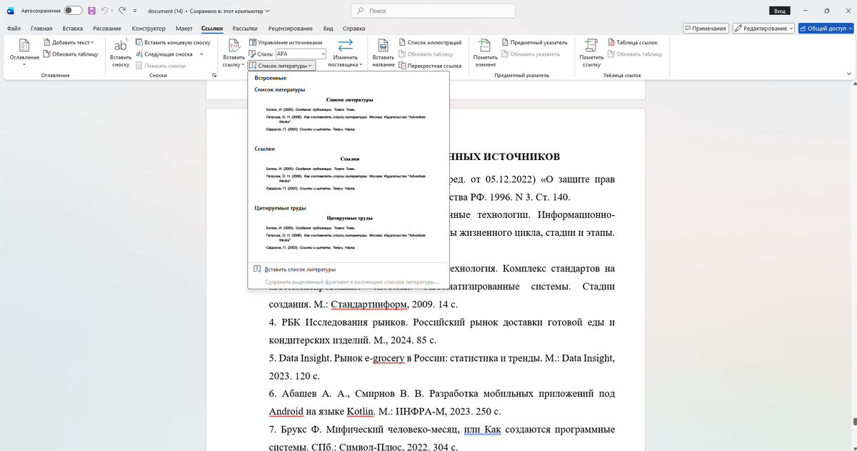 Добавить список использованных источников в диплом или курсовую можно прямо в Word или полностью автоматизировать это с помощью ИИ‑сервисов. Как вставить список источников в Word 1. Откройте вкладку «Ссылки → Управление источниками» и добавляйте книги, статьи, сайты через «Создать». 2. В тексте вставляйте ссылки через «Вставить цитату», а в конце работы нажмите «Ссылки → Список литературы», чтобы Word сформировал готовый блок по выбранному стилю. Нейросети уже умеют подбирать литературу по теме работы и автоматически оформлять список по ГОСТ: книги, статьи, сайты, диссертации — за пару минут вместо нескольких часов ручной верстки. В A4DOC.AI мы сделали этот процесс ещё проще: сервис понимает контекст работы, подтягивает релевантные источники, оформляет их в едином стиле, сортирует по ГОСТ и готовит аккуратный список литературы.