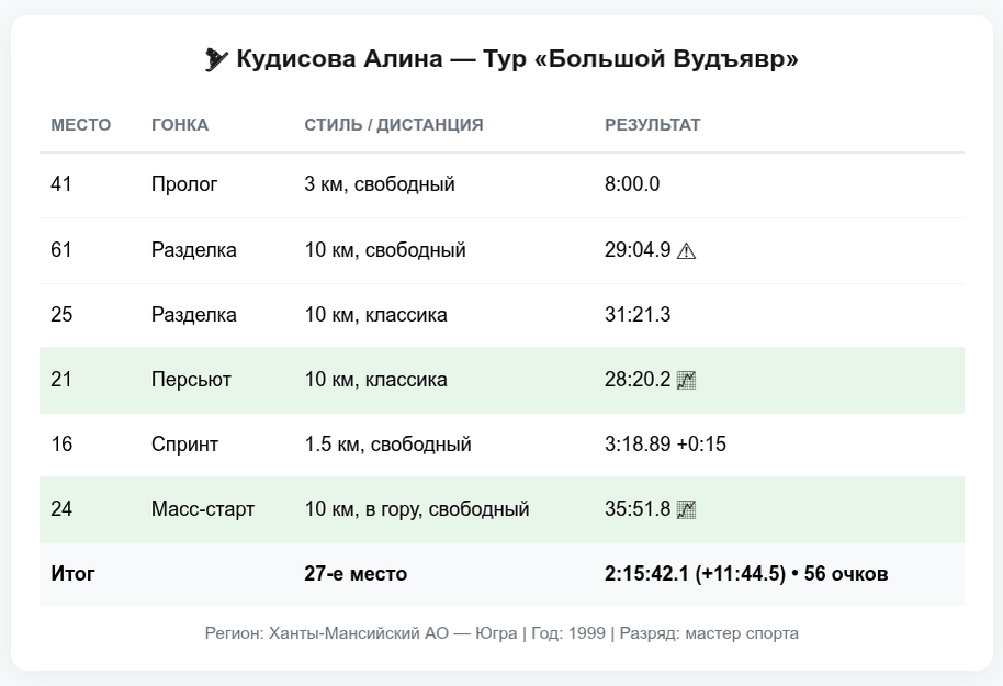 Алина Кудисова — по сути, весь сезон 2025/26 уже бегает в лыжных гонках. Она не «новичок», а спортсменка в процессе адаптации. И прогресс налицо: на Туре «Большой Вудъявр» она стала лучшей среди представительниц Ханты-Мансийского АО, а в общем зачёте Кубка России идёт вплотную к топ-20. Те, кто видел её марафон на Чемпионате России в Южно-Сахалинске, помнят: Алина шла в группе лидеров, пока не случился тот самый эпизод с собакой на трассе. Медаль была близка. На Вудъявре сказались и последствия того падения, и ещё не до конца выстроенная «лыжная» выносливость. Но главное — она уже конкурентна. И это факт.