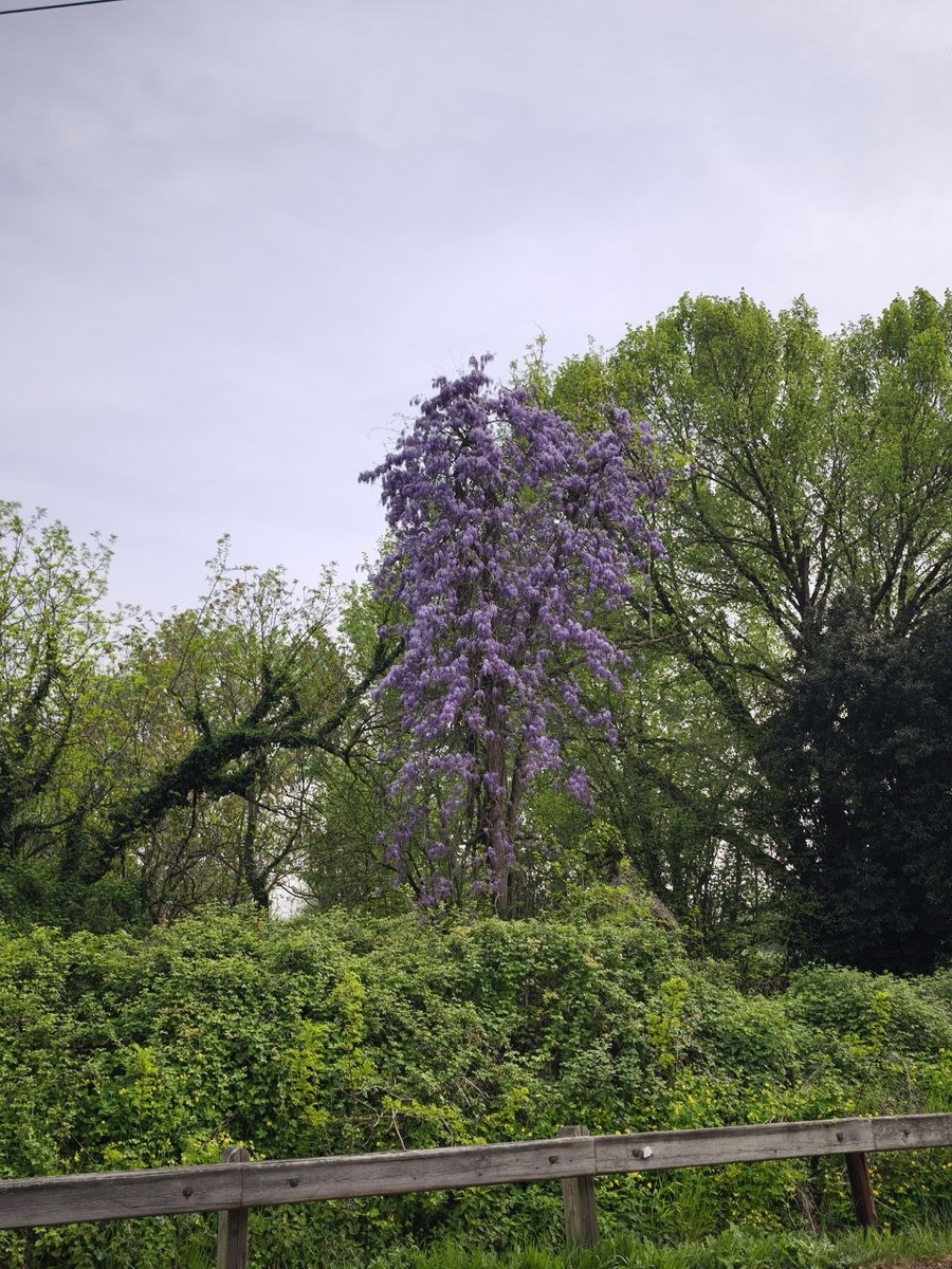 Ближайшее подмиланье, короче. От нашей деревни дорога резко сворачивает налево в ПГТ Поаско. Пешеходных дорожек там нет, поэтому мысли прогуляться в соседнее село у меня никогда не возникало. Тем более, что водители тут носятся так, будто специально норовят оказаться на соседнем же кладбище - венков с крестами по обочинам дороги предостаточно. Да и я, если выхожу за ворота - сразу чешу к остановке автобуса. Сильно занятой, короче. И получилось, что чувство самосохранения и череда "важных дел" все это время мешали мне увидеть этот сиреневое дерево в цвету. Не знаю, что это, но выглядит чарующе. Говорят же, что все происходит в свое время. Так и есть...