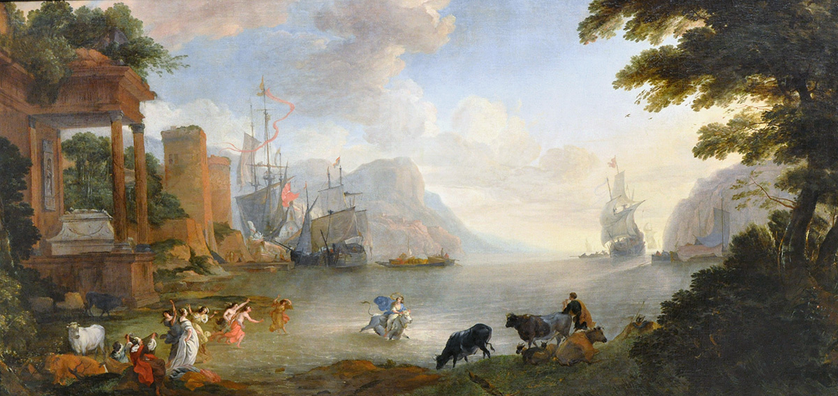 Малоизвестный художник, Хендрик ван Миндерхаут (1632–1696), был голландским живописцем, поселившимся в Антверпене в 1672 году. Там он стал частью группы североевропейских художников, писавших пейзажи, порты и битвы, работавших в стиле итальянского художника Сальватора Розы (1615–1673). Эта группа следовала традиции фантазийной пейзажной живописи, которая контрастировала с реалистичными изображениями природы, встречающимися у многих нидерландских художников того времени. Критская сцена Миндерхаута, изображающая похищение Европы Юпитером, принявшим облик быка, была прежде всего лишь предлогом для написания береговой линии. Основной сюжет был фактически скрыт закрашиванием и обнаружен лишь в 1992 году, когда картина была отреставрирована. Фламандская живопись XVII века иногда создает проблемы с атрибуцией; трудно различить вклад в одну и ту же картину художника-портретиста, художника-натюрмориста и художника-пейзажиста. По этой причине пейзажи Миндерхаута часто путали с работами Питер