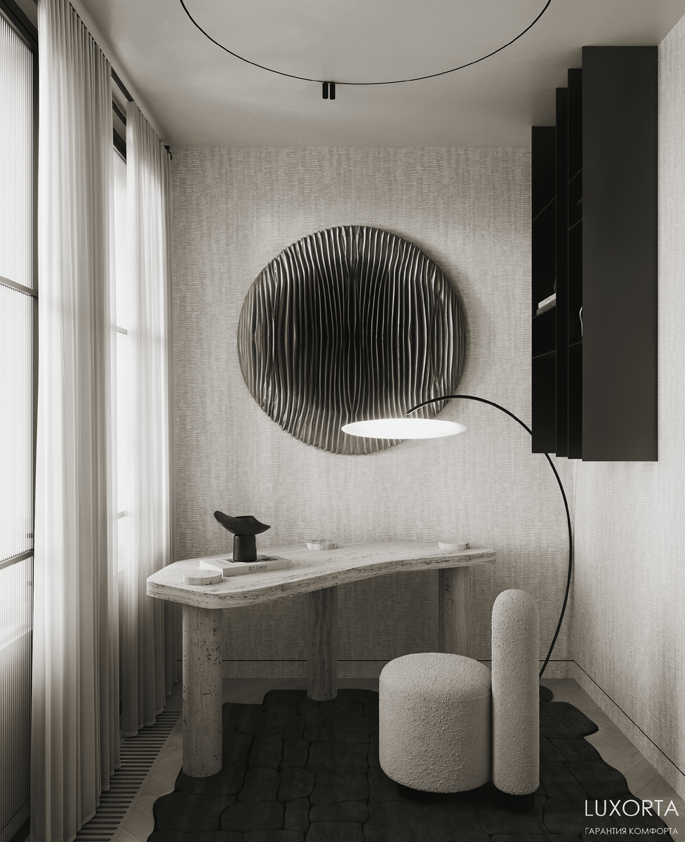 Дизайн: @luxorta Проект: #ЖКSvetlanaPark Расположение: Санкт-Петербург Год: 2025 Центральным элементом кабинета стал заказной стол сложной формы из травертина, перекликающийся с отделкой других комнат. Атмосферу дополняют радиусные панели и текстурированные обои. Это не пространство для постоянной регулярной работы, а скорее место для уединения, где заказчики смогут разобрать документы, ответить на письма или провести видеоконференцию. Проект полностью: https://luxorta.ru/portfolio/904-dizajn-kvartiry-v-zhk-svetlana-park