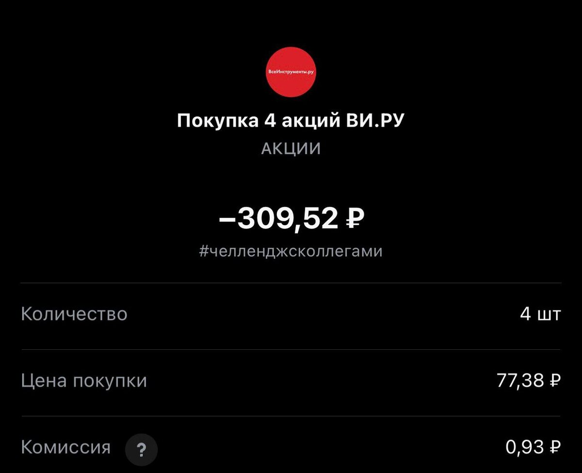 ! Сегодня покупка #394 с учетом оставшихся денег с прошлых сделок. Статистика портфеля на стороннем сервисе, можно посмотреть по "ссылке" Напомню это челлендж с коллегами, каждый рабочий день пополняем брокерский счет на 250 рублей и инвестируем. Если возникли вопросы или есть не понимание, что делать. Задавайте «тут» Покупка #394 🟢 «ВИ.РУ» 77.38 rub #VSEH 4 лота #каждыйсможет #челенджсколлегами TG MAX