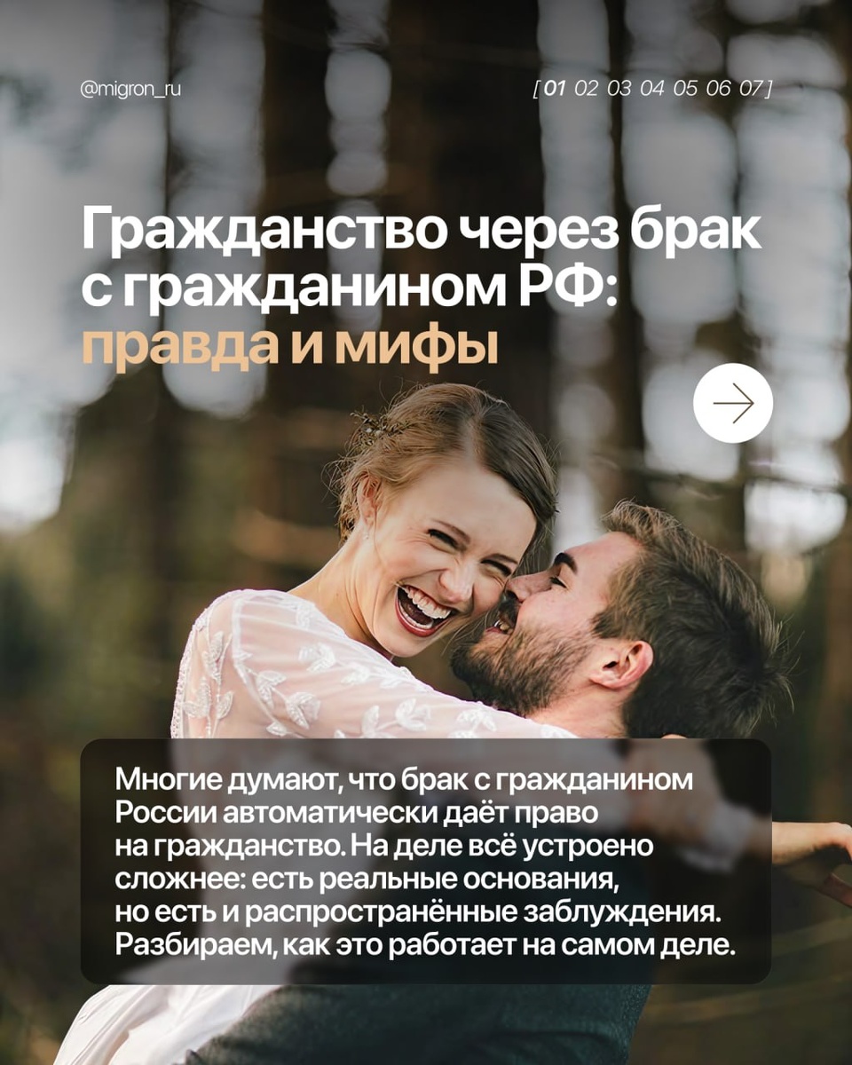 Многие думают, что брак с гражданином России автоматически дает право на получение гражданства страны. ❗️Увы, на деле все устроено немного сложнее. Да, основания на гражданство реальны, но есть и распространенные заблуждения. Этим прекрасным вечером мы разберем, как это работает на самом деле. ✔️ Делитесь этим постом с друзьями и близкими, им полезная информация точно пригодится! ✔️ И подписывайтесь на канал, здесь только самая важная информация для иностранцев в России!