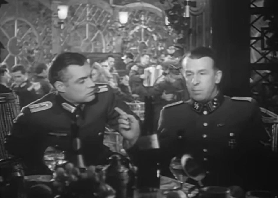 Пятерых ученых награждают за создание «Фау-2». Биг бэнд заключенных лагеря в черных ермолках исполняет приджазованные «Грёзы любви». Юные пловчихи в черных трико образуют в бассейне свастику, железный крест с нею же посередке и эмблему СС.