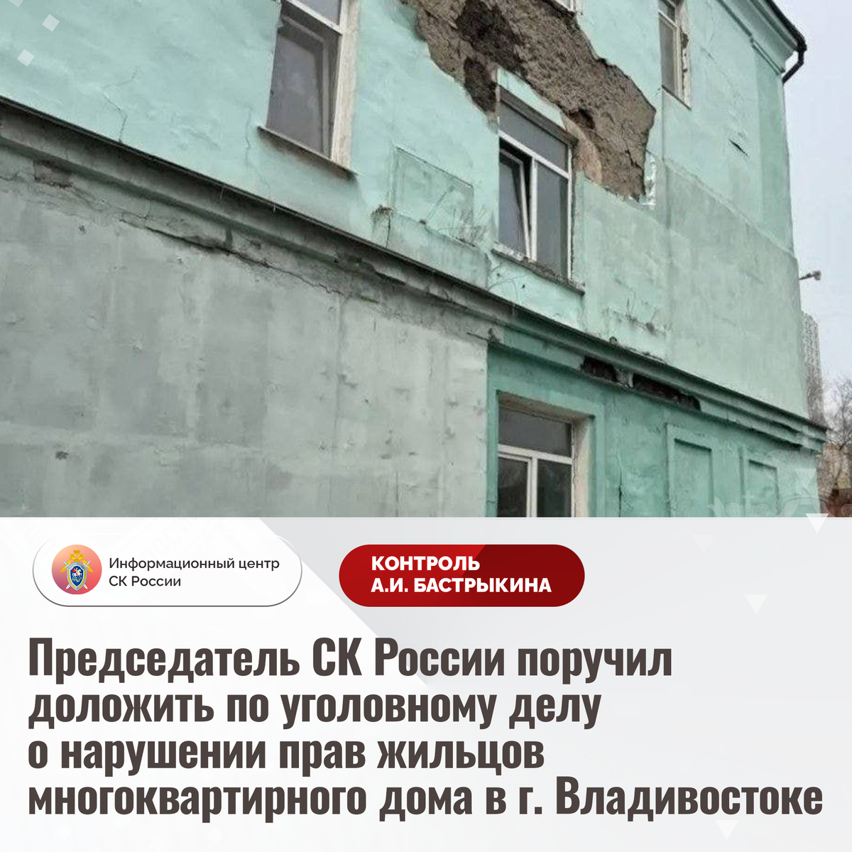 Председатель СК России поручил доложить по уголовному делу о нарушении прав жильцов многоквартирного дома в г. Владивостоке В СМИ сообщается о ненадлежащем обслуживании и содержании многоквартирного дома на улице Пихтовой в городе Владивостоке. Техническое состояние здания 1938 года постройки не соответствует требованиям безопасности, на фундаменте образовались многочисленные трещины. В апреле текущего года из-за намокания штукатурного слоя фасада произошло его частичное обрушение. Несмотря на то, что конструкции строения не подлежат восстановлению, до настоящего времени оно аварийным не признано. В СУ СК России по Приморскому краю по данному факту возбуждено уголовное дело. Председатель Следственного комитета Российской Федерации Александр Иванович Бастрыкин поручил и.о. руководителя СУ СК России по Приморскому краю Анне Сергеевне Полонской доложить о ходе и результатах расследования уголовного дела. Исполнение поручения поставлено на контроль в центральном аппарате ведомства. #Следс