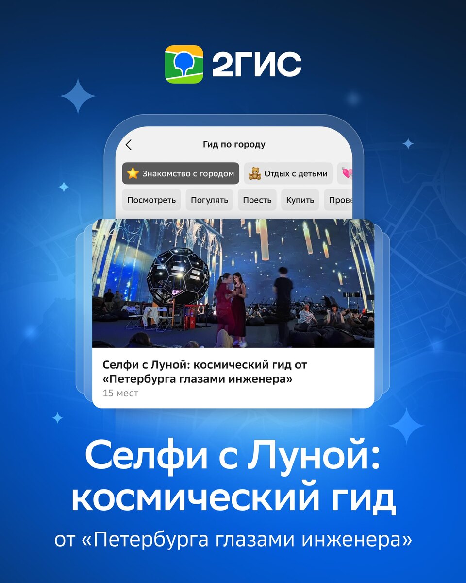 🚀 Ко Дню космонавтики в 2ГИС появилась подборка необычных мест Санкт-Петербурга от проекта «Петербург глазами инженера». С гидом можно превратить воскресную прогулку по городу в настоящее приключение: 🌝 Сделать селфи с Луной? ☄️ Посмотреть на звёзды и настоящий метеорит? 👽 Может, найти тайные знаки во дворах Северной столицы? Или всё сразу? В гиде собраны 15 мест для вашей космической экскурсии по городу. Открывайте подборку и отправляйтесь исследовать Петербург ✨