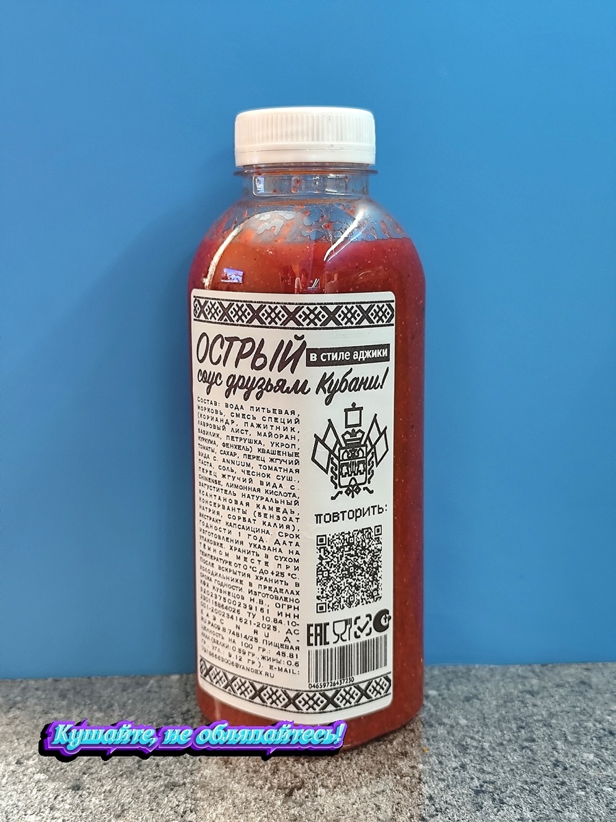 У нас снова КФХ Кузнецов Н.В. со своим остреньким соусом. На сей раз в стиле аджики. Соус снова в пол-литровом пузыре, что намекает на не особо мощную остроту. Зато на вкус должен быть неплохим, судя по составу: Соус средней густоты. Пахнет как практически любая аджика. На вкус тоже как аджика, только с привкусом квашеных помидорок и соли не так много, как в обычной аджике. Острота посильнее, чем в классическом Табаско, но слабее, чем в Табаско Хабанеро. Т.е. где-то 7-8 тысяч SHU. Вкусный соус, к мясу хорошо идёт. Брал на "Озоне" по 264 рубля за 0.5 л (сейчас этот соус стоит 199 рублей с картой "Озон банка").