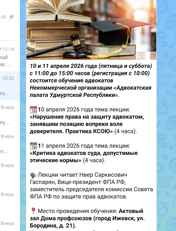 Сегодня в Доме профсоюзов Ижевска прошёл первый день обучения адвокатов. Говорили о важном – об этических нормах поведения в судебных заседаниях. Лектор раскрыл тему живо, с примерами из практики. Вот два более запомнившихся: 🔹 Республика Саха (Якутия) – участник уголовного дела, недовольный приговором, назвал прошедший процесс «судилищем». Провели проверку, но к ответственности его не привлекли. 🔹 Моя личная практика начала 2000-х, Можгинский суд – подсудимый после приговора громко заявил ТО ЖЕ САМОЕ слово. Но итог оказался иным: возбудили новое дело за неуважение к суду, наказание ужесточили. Один и тот же поступок – а последствия диаметральные. Где же справедливость и единообразие подходов? 🤷♂️ Ещё один яркий пример. Адвокат по гражданскому делу решила доказать личную заинтересованность судьи. Она следила за судьёй, за его машиной, фотографировала, как он лично приезжал к месту работы ответчика и встречался с ним. В итоге – отвод судьи удовлетворён, дело передали другому. Победа
