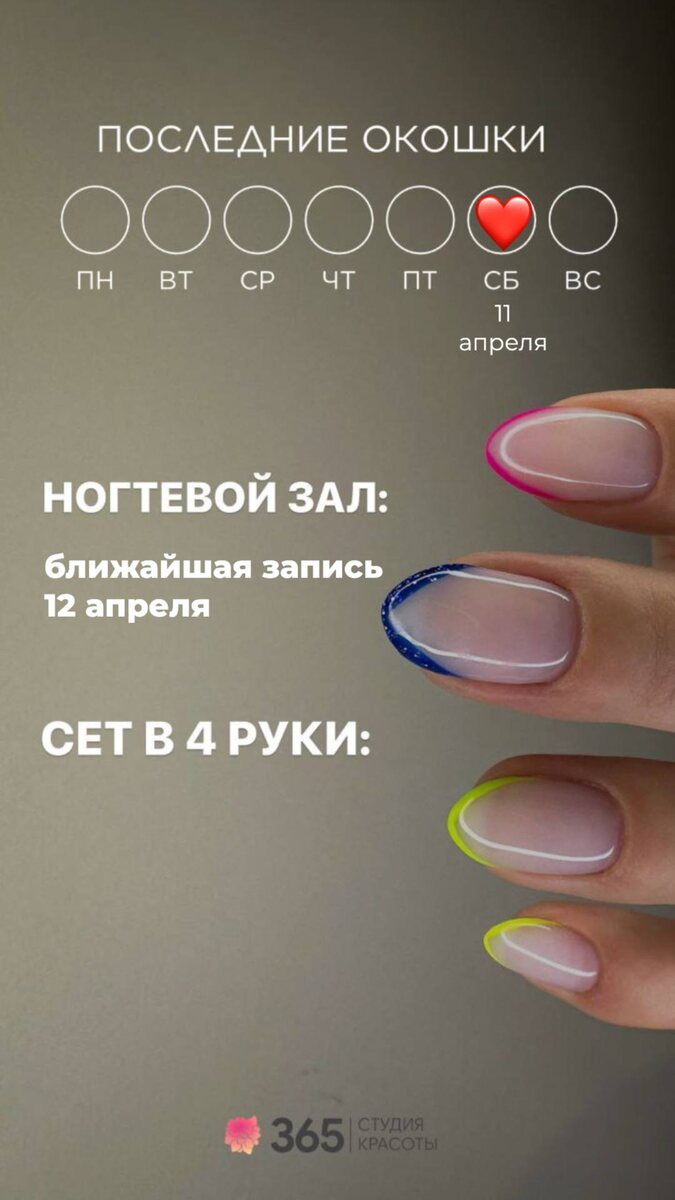 ❤ Долгожданная суббота так и намекает на время уединится в нашей тёплой студии для расслабления и отдыха 🎀 ЧТО МОЖНО УСПЕТЬ СДЕЛАТЬ 11 апреля 2026 года : Ногтевой зал: ближайшая запись 12 апреля Косметология: 10:00 12:00 14:00 17:00 19:30 Парикмахерский зал: Ближайшая запись на 13 апреля ЗАПИСАТЬСЯ МОЖНО ЛЮБЫМ УДОБНЫМ СПОСОБОМ: 👉🏻 Сообщение в Whats'app https://wa.me/79663654477 👉🏻По телефону +79663654477 👉🏻Онлайн запись https://n286444.yclients.com/ #команда365 #красота #наслаждение #забота #весна #апрель #любовь #мечтысбываются #радость #возможность