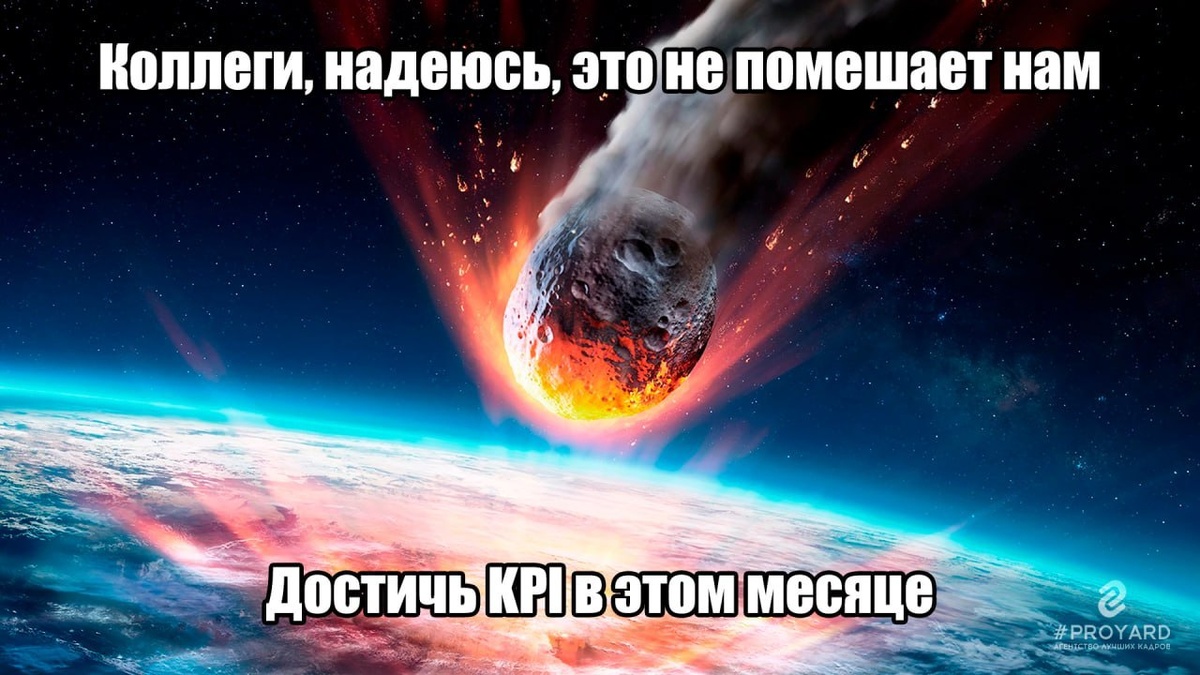 Даже с учётом форс-мажоров. Даже с учётом метеорита. ☄️ 😉 Хотите, чтобы команда не молилась на метеорит, а спокойно работала? Ставьте цели по сезону. ✨ А если нужны сотрудники, которые и с метеоритом справятся — пишите @EvgeniyaYurlova. 🇷🇺 Наш канал в MAX #PROYARD #KPI #планирование #рекрутинг #рабочийюмор PROYARD - Агентство лучших кадров
