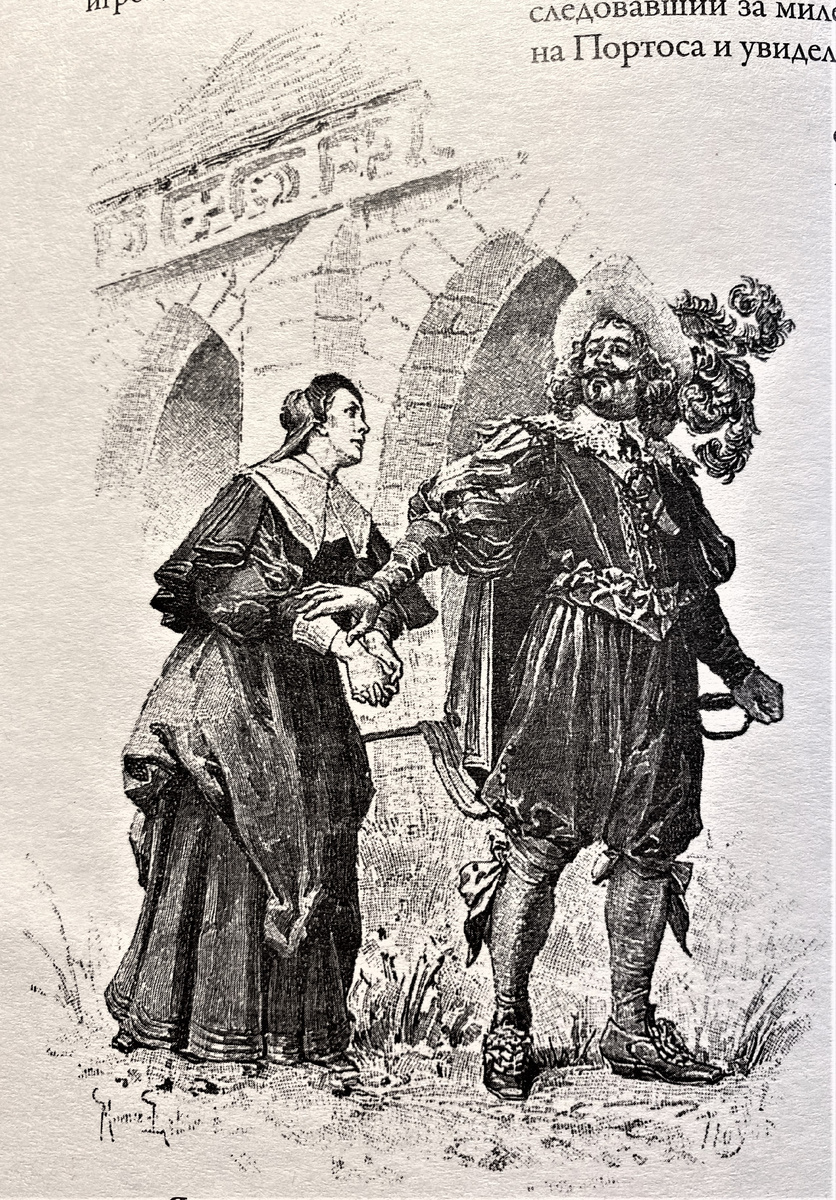 Удивительное дело, но этой великолепной истории вы не увидите ни в одной экранизации "Трех мушкетеров". Кинематографисты мучительно пытаются придумать что-то новенькое и даже не догадываются, что надо просто открыть роман Дюма — там новое для них и обнаружится. Видимо, сценаристы считают, что читать — это для слабаков. А вот зря. Эта история в романе великолепна — здесь и юмор, и сатира, и источник немалого числа, говоря современным языком, мемов: "Я уважаю старость, но не в вареном и жаренном виде". Морис Лелуар не стал пропускать эту замечательную главу — создал три (3) иллюстрации к ней. Хотя, конечно, начинать надо раньше — в той сцены, когда Портос, чтобы вызвать ревность госпожи Кокнар, изображал, будто любезничает с некой прекрасной дамой (это была миледи). Эти иллюстрации вы видели в теме миледи. Миледи, естественно, не отвечала Портосу — она и не видела, что кто-то изображает их диалог на расстоянии, но госпожа Кокнар ревновала и потом высказала Портосу все, что об этом думает