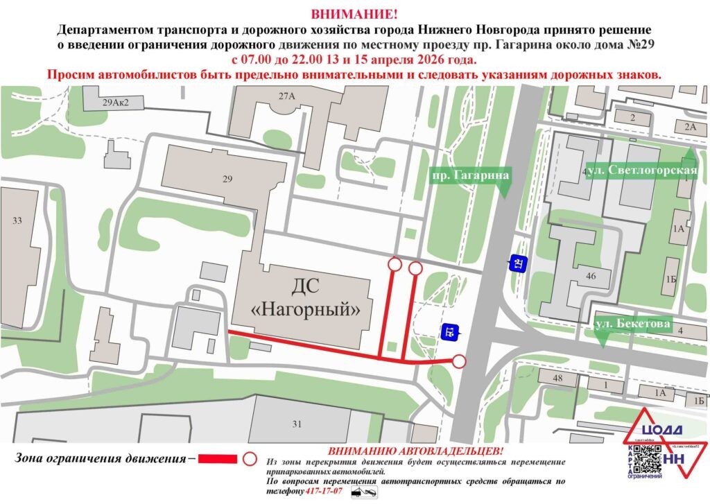 В Нижнем Новгороде 13 и 15 апреля ограничат движение по местному проезду проспекта Гагарина у Дворца спорта «Нагорный». Об этом предупредили в городской администрации. Проезд ограничат из-за проведения хоккейных матчей во Дворце спорта. 13 и 15 апреля здесь сыграют нижегородское «Торпедо» и магнитогорский «Металлург» в рамках ¼ плей-офф Кубка Гагарина. Проезд будет закрыт с 07:00 до 22:00 оба дня. «Просим водителей заранее переставить автомобили за пределы ограничительных зон. Оставленные в зоне действия ограничений транспортные средства подлежат принудительному перемещению. Информацию о перемещенных автомобилях можно узнать по телефону справочной службы: 417-17-07», — отметили в администрации. Напомним, что автомобилисты не смогут проехать по улице Маршала Жукова с 13 апреля