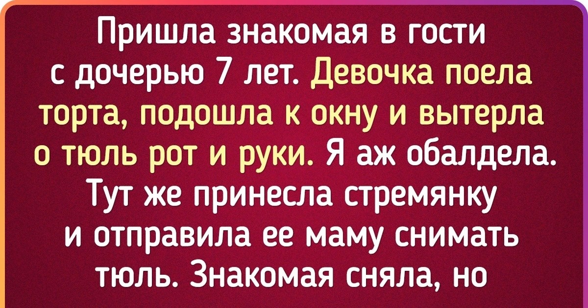 Пришла знакомая в гости с дочерью 7 лет. Девочка поела торта, подошла к окну и вытерла о тюль рот и руки. Я аж обалдела. Тут же принесла стремянку и отправила ее маму снимать тюль. Знакомая сняла, но обиделась. А мне начхать на ваши обиды! Воспитывать нужно своих чадушек. © Svetlana Redko