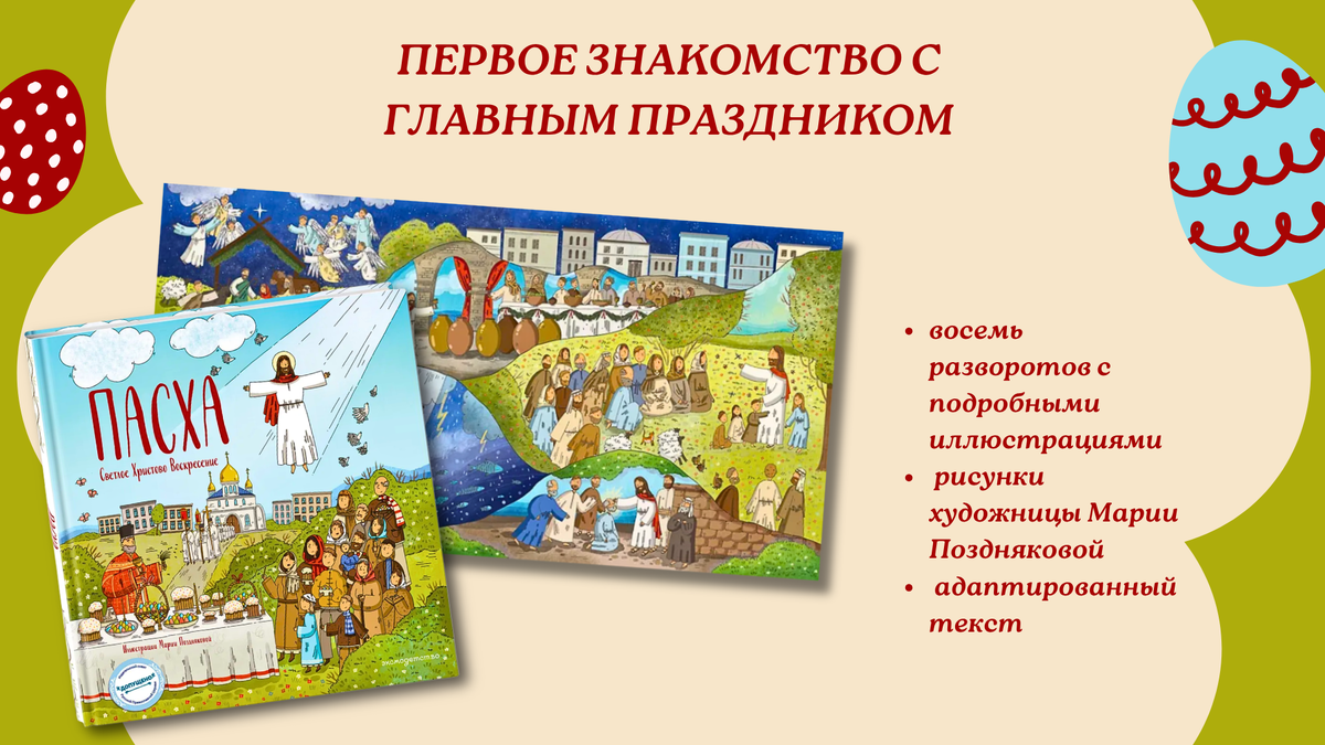 Пасха — праздник, который многие ждут с детства. Куличи, крашеные яйца и семейный стол. Но если подарки к этому дню ограничиваются только сладостями, стоит задуматься: а что останется после того, как кулич будет съеден? Книга — подарок, который не портится, не съедается и не забывается через неделю. Особенно если она рассказывает ребёнку о самом празднике. Без сложных слов, без назиданий — просто и интересно. Мы собрали четыре издания, которые помогут детям понять, что такое Пасха, кто такой Иисус и почему этот день называют Светлым Христовым Воскресением. Это целое путешествие. Ребёнок не слушает скучный пересказ, а рассматривает картинки, на которых изображены ключевые моменты евангельской истории. Текст адаптирован специально для детей: крупный шрифт подходит для самостоятельного чтения. Иллюстрации Марии Поздняковой — это отдельный вид искусства. Детальные, яркие, живые. Ребёнку не будет скучно: каждый разворот можно рассматривать по 10–15 минут, находя новые детали. Важно: книга д