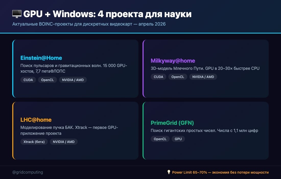 Видеокарта простаивает ночами? Вот 4 проекта, которые загрузят её наукой Если на Windows стоит дискретная NVIDIA или AMD — можно отдать её вычислительную мощность реальным исследованиям. Установить BOINC, выбрать проект, поставить лимит по энергопотреблению — и GPU работает, пока ты спишь. Вот что запустить прямо сейчас. Einstein@Home — поиск пульсаров и гравитационных волн