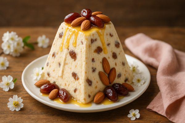 Медовая пасха с лимонными финиками и миндалем: пасхальный десерт в стиле Востока с нежной текстурой и цитрусовым бризом!