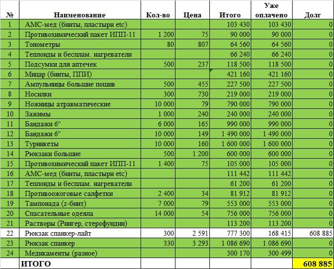 Но уже совсем немного осталось 🙏 По нашему огромному сбору ситуация следующая: ➖ 9 055 244 руб была сумма сбора ➖8 446 359 уже собрали и оплатили поставщикам ❗️608 885 остаток долга и сумма к сбору. Давайте поднажмём 🙏. На время, пока рассчитываемся с совсем старыми долгами, пришлось сильно снизить все новые закупки. Тем самым, заметно снизить и объемы комплектуемых медрюкзаков и аптечек. Спасибо всем, кто устал, но не перестал помогать армии. Без народной поддержки ничего не было бы. Всех этих десятков тысяч спасённых людей не было бы. ✅ Карта канала всегда одна. И по ней публикуются подробнейшие финансовые отчеты. Предыдущий здесь. [2202206127256746] Сбербанк СБП Сбер по номеру +79164388966 Екатерина Павловна Г. ⛔️ Обратите внимание, что мы никогда не приходим ни к кому в личку с просьбами помочь. Любой, кто написал вам в личку первым, даже с аватаркой нашего админа, это в 100% случаев мошенник.