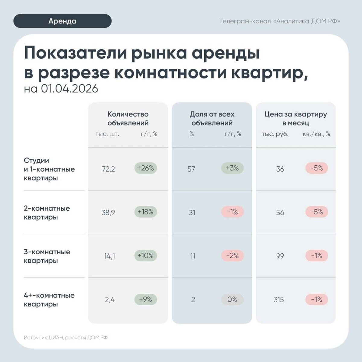 🪖 Число арендных квартир продолжает расти — Дом.РФ ❗️С января 2026 года число активных объявлений выросло до 128 тыс. предложений (+34%). Похожая динамика на рынке была только во II квартале 2022 года. 🔵Основной прирост предложения пришелся на студии и «однушки» — 57% от всех объявлений (+3 п.п. год к году). ⬇️Вместе с этим упали и месячные ставки на аренду: 🔵студии и однокомнатные квартиры — до ₽36 тыс. (-5%); 🔵двухкомнатные — до ₽56 тыс. (-5%); 🔵трехкомнатные — до ₽99 тыс. (-1%).