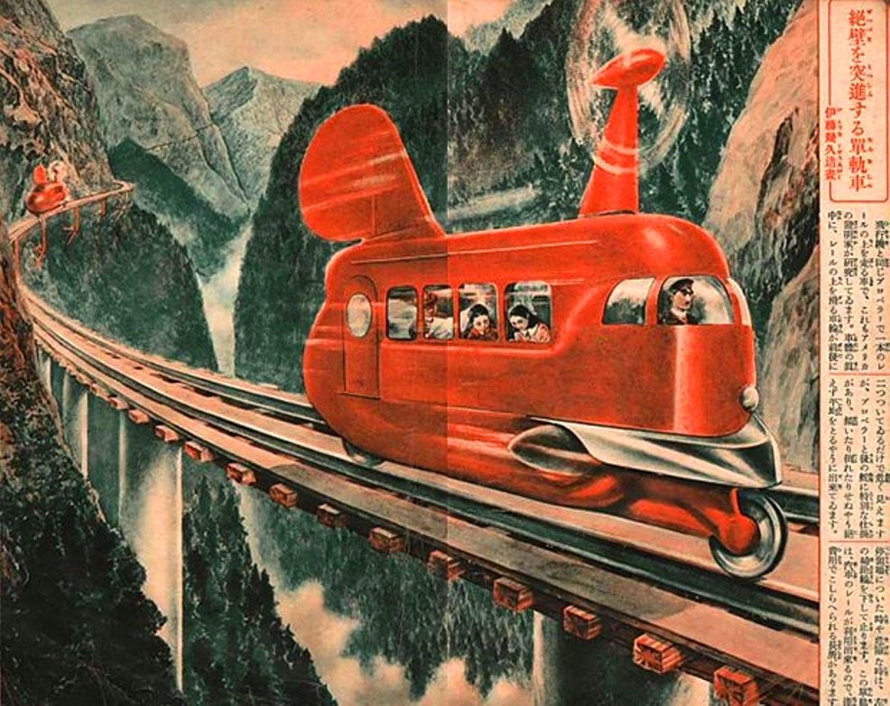 Таким японские футуристы видели транспорт будущего в 30-х годах прошлого столетия: Автомобиль с шарообразными колёсами, монорельсовая железная дорога, самое безопасное пассажирское судно, сверхскоростной пассажирский самолёт и скоростной военный катер-танк — многие из них никогда не увидят свет, а некоторые уже сейчас являются совершенно обыденными вещами, например, монорельс.