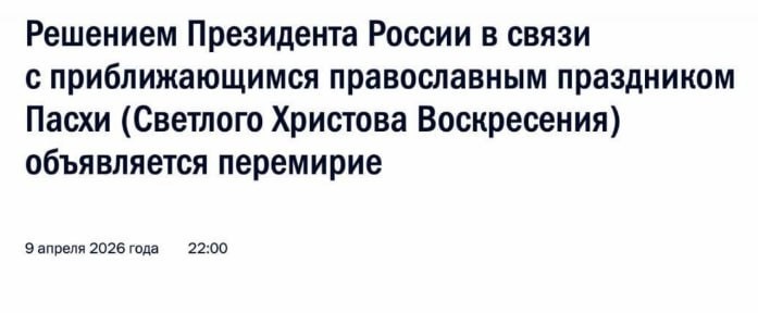 🇷🇺 Путин объявил пасхальное перемирие с 16:00 11 апреля до конца дня 12 апреля.