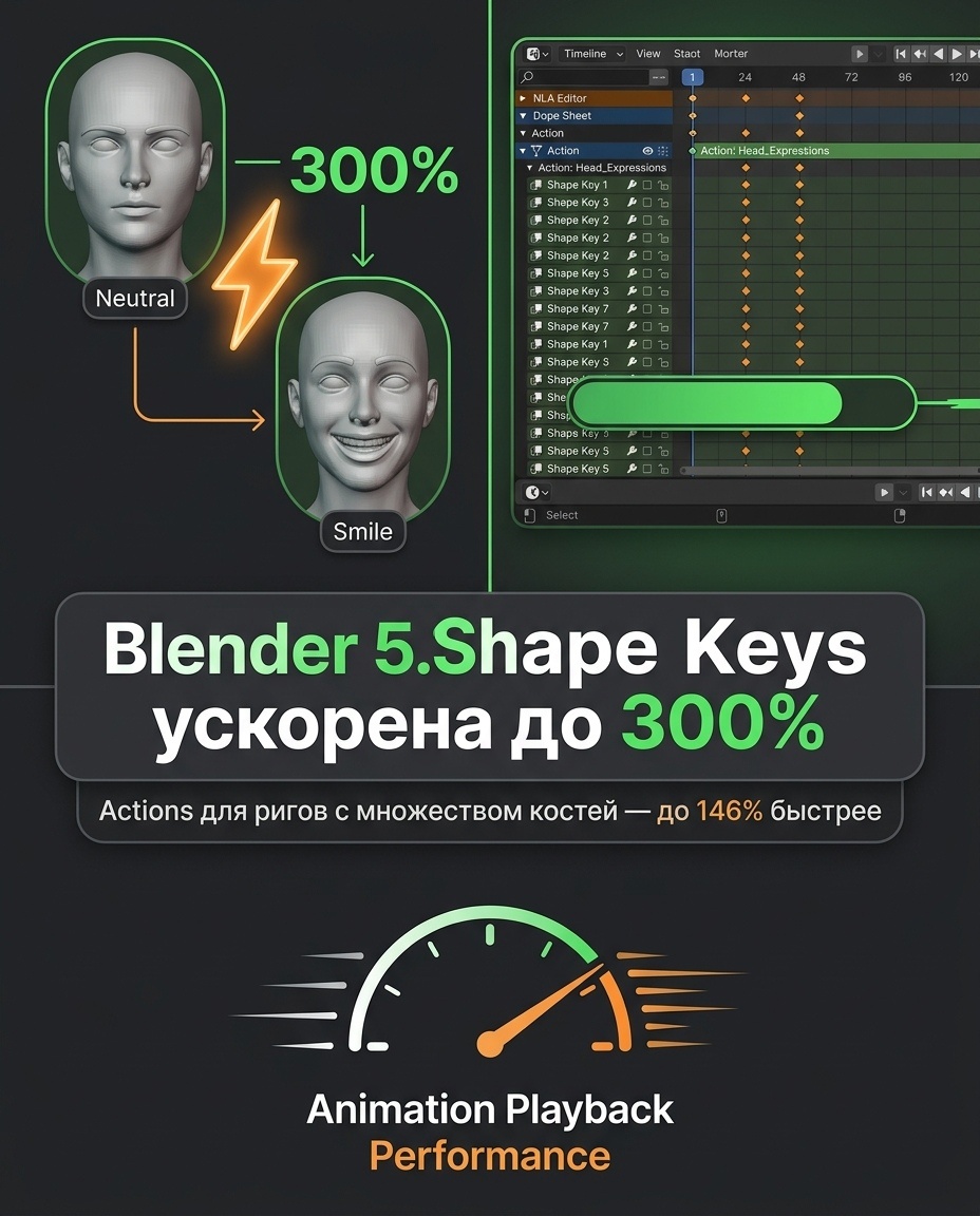 Начнём с самого впечатляющего. Shape Keys (ключи формы) — это технология, которая позволяет плавно менять форму меша, например для лицевой анимации персонажа. В Blender 5.1 оценка Shape Keys ускорилась более чем в 3 раза на высокополигональных моделях .