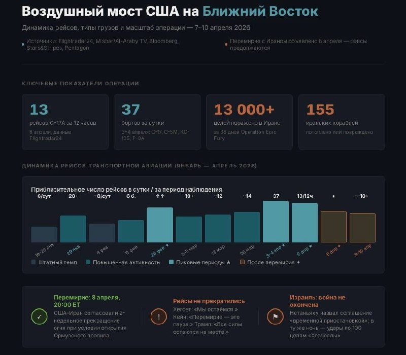 Трамп готовится снова атаковать Американский президент угрожает вновь обрушить всю мощь американских сил на Иран, если переговоры в Пакистане провалятся. Все, говорит, решится в ближайшие 24 часа. Ну, про 24 часа мы уже где-то слышали. Но активность транспортной авиации США говорит о том, что двухнедельную паузу Трамп решил заполнить восстановлением своего боевого потенциала в регионе. Хотя, как мы помним, персы требуют вывода американских сил. По данным Flightradar24 и Misbar, только 6 апреля — за 12 часов — над Средиземноморьем прошли 13 рейсов C-17A Globemaster III. Основная точка вылета — авиабаза Рамштайн (Германия). Точка назначения официально не раскрывается: самолёты отключают транспондеры при входе в израильское воздушное пространство. 3–4 апреля Misbar зафиксировал уже 37 единиц за сутки — грузовые, заправщики, разведчики. В их числе: — 20 C-17A Globemaster III (грузоподъёмность — до 77 тонн каждый) — 2 C-5M Super Galaxy (до 118 тонн, способен везти танки Abrams) — 9 KC