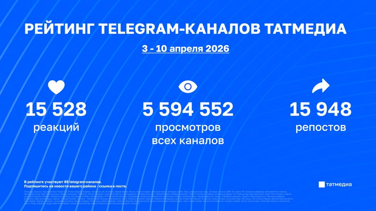 📊📱Продолжаем анализировать замедленный Telegram. Статистика каналов Татмедиа | 3 апреля - 10 апреля Каналы с наибольшим числом просмотров: 1. ТАТМЕДИА - 713 715 2. БЫСТРО - 480 125 3. Новости Зеленодольска - 290 604 4. Татарстан-24 - 268 414 5. НТР 24 - 250 266 Посты с наибольшим числом просмотров: 12 590 🔹 ТАТМЕДИА: Рустам Минниханов предложил увеличить лимиты семейной ипотеки в регионах с дорогим жильём. 7 569 🔹 НТР 24: Первые двое госпитализированных в Москву после происшествия на «Нижнекамскнефтехиме» переведены из реанимации. 4 913 🔹 Происшествия Татарстан: Найден последний погибший в пожаре на «Нижнекамскнефтехиме». 4 868 🔹 Интертат: Шәп әйткән бит Марат Кәбиров? 3 778 🔹 БЫСТРО: Владимир Путин объявил пасхальное перемирие. 3 238 🔹 Татар-информ. Главное: «Взгляд на мир» Полины Илюшкиной. 3 209 🔹 Шәһри Казан: Ак Барс Көрәш сараенда яшьләр арасында 3 яшь категориясендә (13 -14, 15-16, 17-18 яшьлекләр арасында) Россия беренчелеге тәмамланды. 3 064 🔹 Живые истор