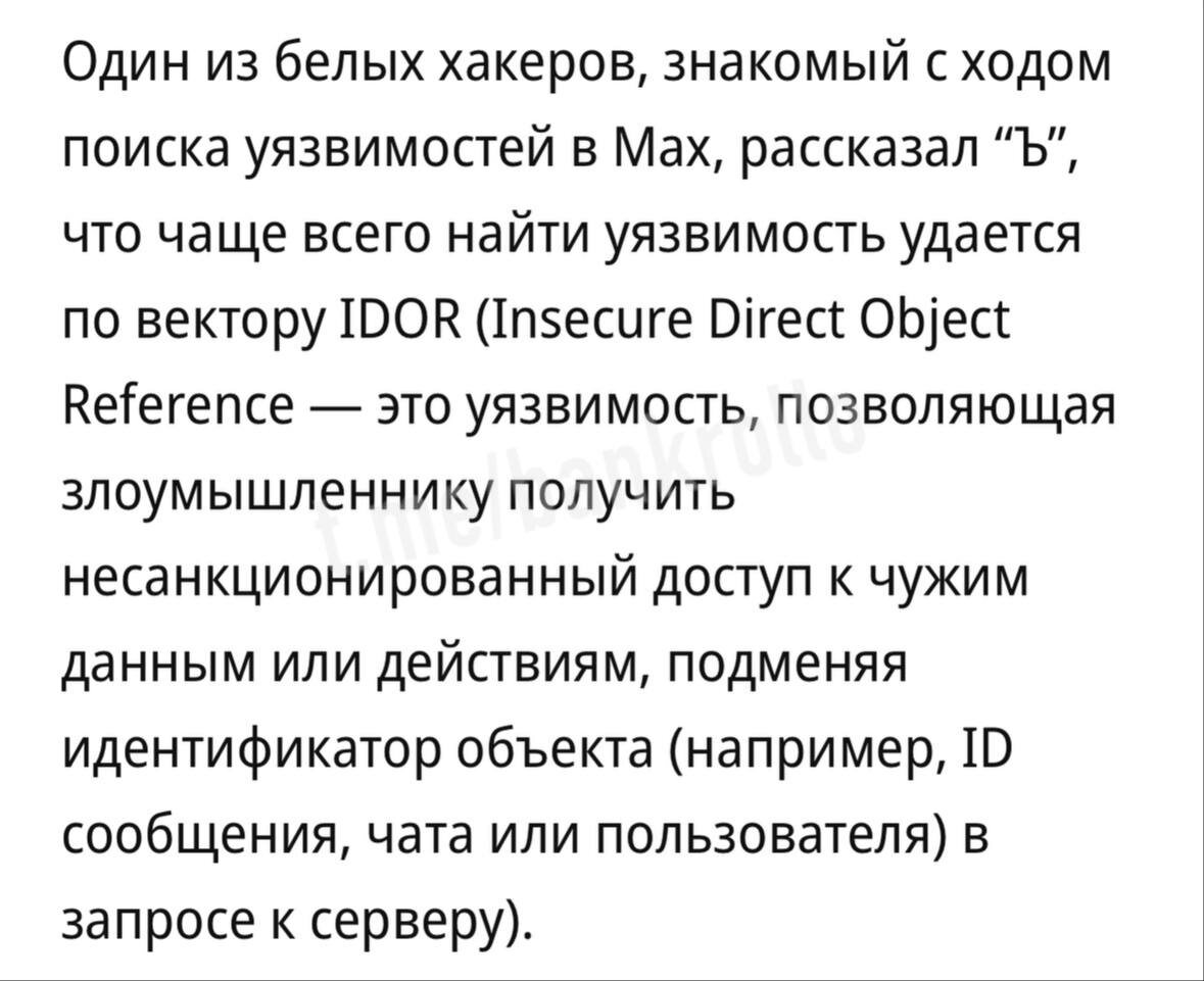 Информация о том, что в Max можно получить доступ к чужим фото и сообщениям через уязвимость типа IDOR, напрямую касается миллионов пользователей. Речь идет о механизме, при котором злоумышленник подменяет идентификатор объекта в запросе к серверу и получает доступ к данным без разрешения. Для обычного пользователя это вопрос приватности. Для рынка — вопрос доверия к цифровой инфраструктуре государства. 🔐 Контекст: ставка на защищенные коммуникации Госмессенджеры создаются как альтернатива зарубежным платформам, с акцентом на безопасность и контроль данных. По оценкам отраслевых аналитиков, сегмент корпоративных и государственных коммуникаций в России растет двузначными темпами на фоне импортозамещения. В такой модели ключевой актив — доверие. Если система позиционируется как защищенная, любые подтвержденные уязвимости бьют по репутации сильнее, чем в коммерческом сегменте. Что такое IDOR и почему это системный риск IDOR — одна из распространенных ошибок в архитектуре веб‑приложени