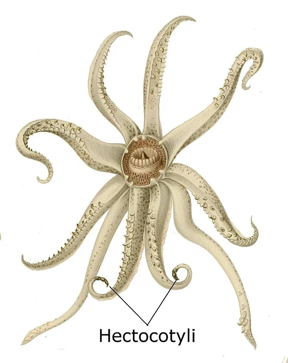 Хотел начать пост с красного слова Черновик, но я за антихайп и у меня нет премиум подписки, поэтому просто обсудим пенис осьминога. Всегда знал что спариваются осьминоги как то странно, но в вопрос не углублялся. А тут наткнулся на описание мужского полового органа - гектокотиль. Это не отдельный орган, а модифицированное щупальце, одно из восьми. Чуть длиннее и иногда имеет другое окончание. Как правило оно выполняет только функцию передачи сперматофоров (что-то вроде мешочков со спермой, которые могут храниться у самки какое то время перед оплодотворением). А еще у некоторых видов самец может его сбросить, чтобы после спаривания не сожрала самка (как у богомолов, но это редкость). Искал картинку для иллюстрирования и снова понял, что хрен найдешь точную схему. Хоть иди и рисуй сам. Тут яркий пример чуши, которая была первой при поиске в яндексе: Должно быть не 10, а 8 конечностей. Гектокотиль всего 1. И это самая длинная щупальца. Про пасть я вообще молчу. Явно кальмар, а не о