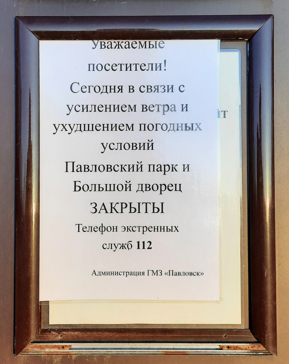 8 апреля никаких совещаний не проводилось. Весна в Петербурге взяла паузу и в этот день объявили резкое ухудшение погодных условий, порывистый ветер и всё такое прочее. На сайте ГМЗ написали, что парк и дворец закрыты до 14:00. Погода была солнечная, ветерок задувал не так сильно как пугали и мы поехали к двум часам, хотя надежды, что парк откроют было мало. Так и получилось. Оно и правильно, если честно. Дерево на голову упадёт, кто отвечать будет?