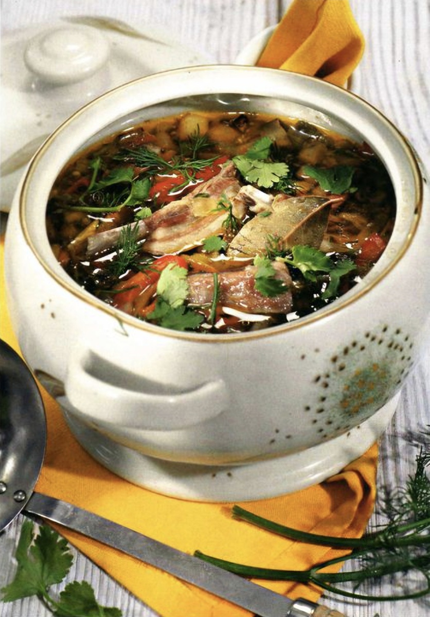 Суп отличается насыщенным, глубоким вкусом с гармоничным сочетанием ингредиентов. Бараньи рёбрышки придают бульону сытность и лёгкую пикантность, характерную для баранины. Обжаренные баклажаны добавляют лёгкую грибную нотку и нежную текстуру, а сладкий красный перец вносит лёгкую сладковатость и свежесть. Морковь, лук и сельдерей создают классическую овощную основу с чуть сладковатым, слегка пряным оттенком. Манная крупа делает суп чуть более густым и бархатистым, смягчая общий вкус. Лавровый лист добавляет тонкую пряную изюминку. В итоге получается сбалансированный, согревающий суп с богатым, многослойным вкусом, в котором удачно сочетаются мясные и овощные ноты.