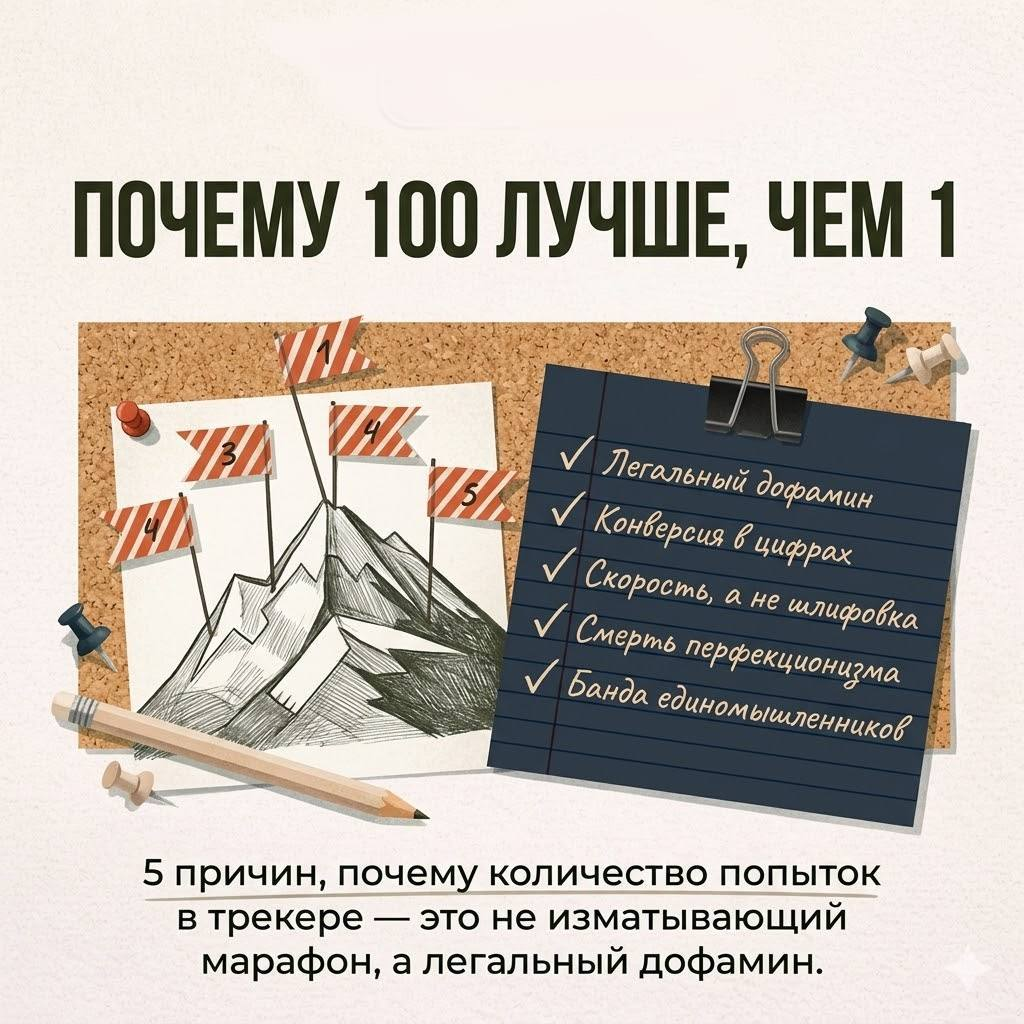 Когда вы уже определились с вашим фокусом, нет причин медлить и бояться. «5 причин, почему 100 попыток лучше, чем 1 идеальная» 🧟Смерть перфекционизма. Когда попыток 100, каждая отдельная может быть «на троечку». Это невероятно освобождает. 👩🏻💻Статистика. Вы наконец поймете свою воронку. Может, вам нужно 20 отказов, чтобы получить 1 продажу? Теперь вы будете это знать. ⏰Скорость. Пока другие полируют один пост месяц, вы за этот месяц делаете 30–50 итераций и уже на 10-й понимаете, что заходит вашей аудитории. 🍑Легальный дофамин. Трекер превращает рутину в игру. Вы начинаете охотиться за галочками. 🫂Окружение. Делать 100 попыток в одиночку может быть странно и быстро надоест. Делать их в банде таких же заряженных людей азартно. Цена входа сейчас 2500 р . Это меньше, чем стоимость одной ошибки из-за бездействия. https://bbcreative.ru/100