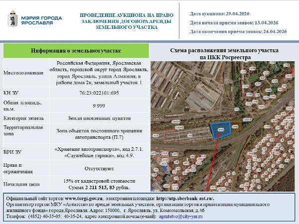 , земельный участок 1 Канал: Госземля Ярославская область Область: обл Ярославская Район: г.о. город Ярославль Населенный пункт: г Ярославль улица Алмазная, в районе дома 2к, земельный участок 1 Локация: Смотреть на карте ВРИ: Хранение автотранспорта Кадастровый номер: 76:23:022101:695 Кадастровая стоимость: - Вид сделки: Аренда Площадь: 9999 м² Начальная цена: 2211513.00 руб. Дата завершения: 24.04.2026 Подробнее: ГИС ТОРГИ #госземля #земляотгосударства #земля #земельныйучасток #земельныеторги #торги #аукцион #арендаземли #аренда #ярославскаяобласть
