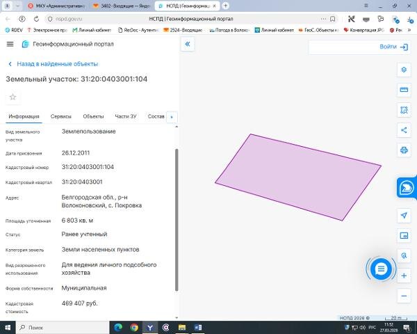 м, расположенный по адресу: Белгородская область, Волоконовский район, с. Покровка (зона садоводства, огородничества и дачного хозяйства СХ101) разрешенное использование – для ведения личного подсобного хозяйства Канал: Госземля Белгородская область Область: обл. Белгородская Район: м.р-н Волоконовский Населенный пункт: с.п. Покровское Белгородская область, Волоконовский район, с. Покровка Локация: Смотреть на карте ВРИ: Ведение личного подсобного хозяйства на полевых участках Кадастровый номер: 31:20:0403001:104 Кадастровая стоимость: - Вид сделки: Продажа Площадь: 6803 м² Начальная цена: 469407.00 руб. Дата завершения: 23.04.2026 Подробнее: ГИС ТОРГИ #госземля #земляотгосударства #земля #земельныйучасток #земельныеторги #торги #аукцион #продажаземли #продажа #белгородскаяобласть
