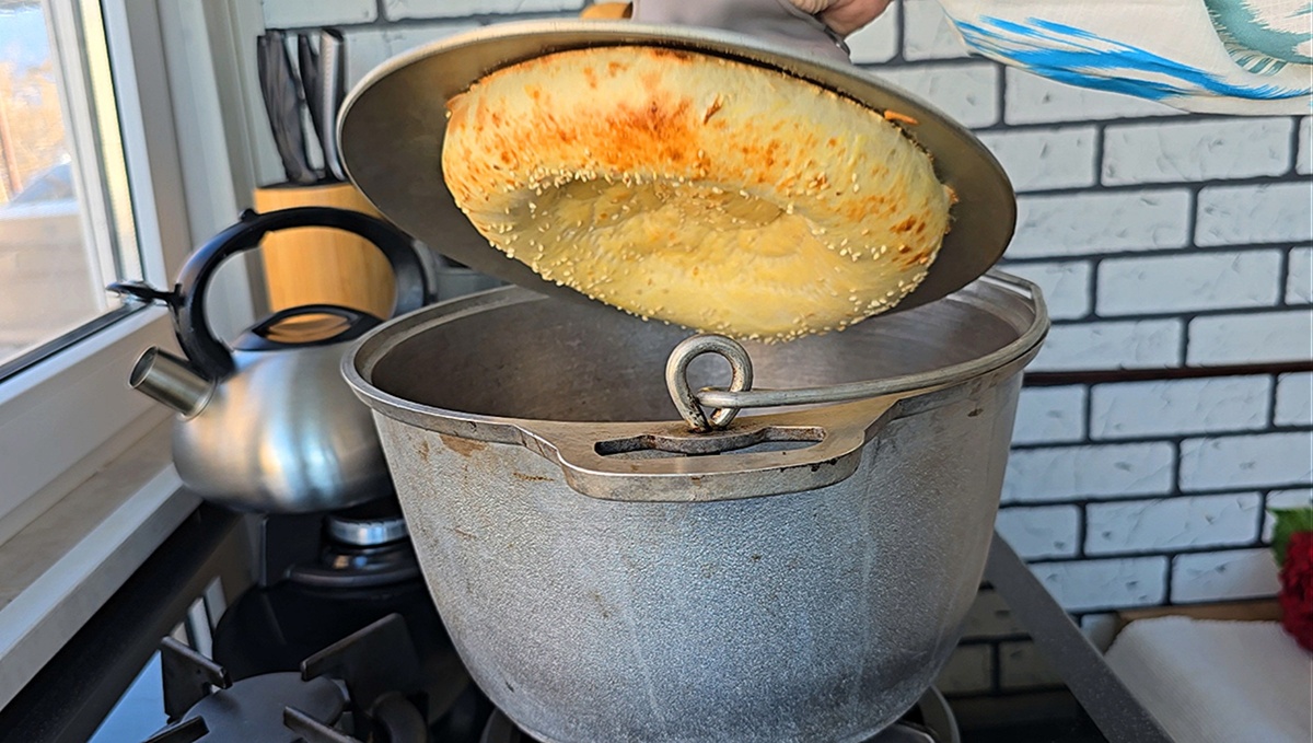 Переворачиваем крышку казана так, чтобы лепёшка оказалась внутри и плотно закрепилась, затем закрываем казан крышкой.