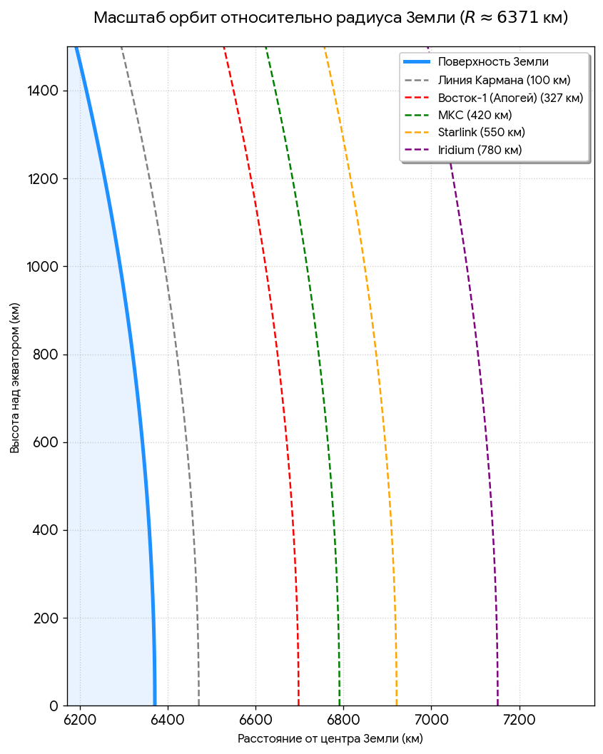 Для визуализации масштаба воспользуемся графиком, который показывает «край» Земли. Из-за огромного радиуса планеты (6371 км) все упомянутые объекты находятся в очень узкой приземной зоне — в пределах 12% от радиуса Земли.