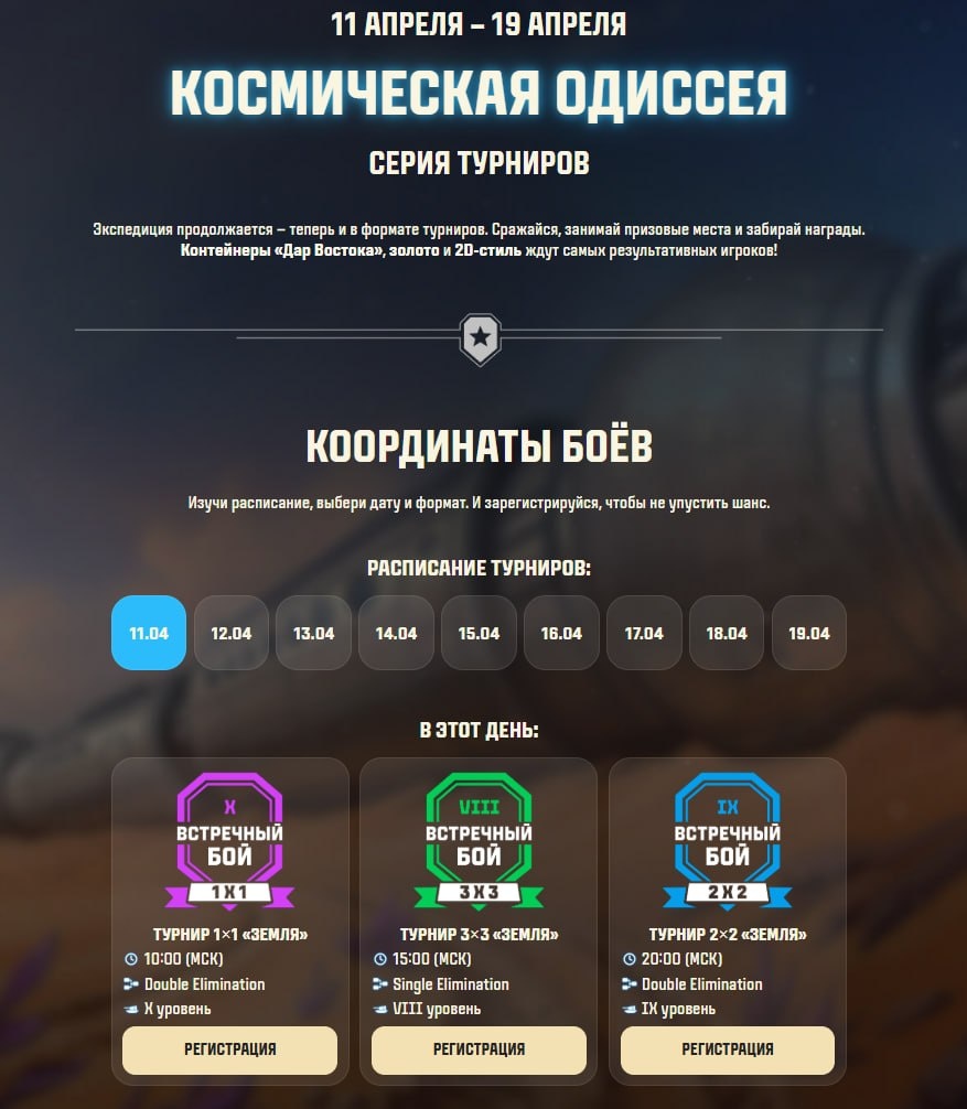Внимание, пилоты! С 11 по 19 апреля стартует серия захватывающих турниров «Космическая Одиссея» — шанс проверить скилл, встретиться с сильнейшими соперниками и выиграть щедрые призы. Мероприятие рассчитано на игроков разных форматов и уровней, так что и одиночки, и команды найдут себе испытание по вкусу.