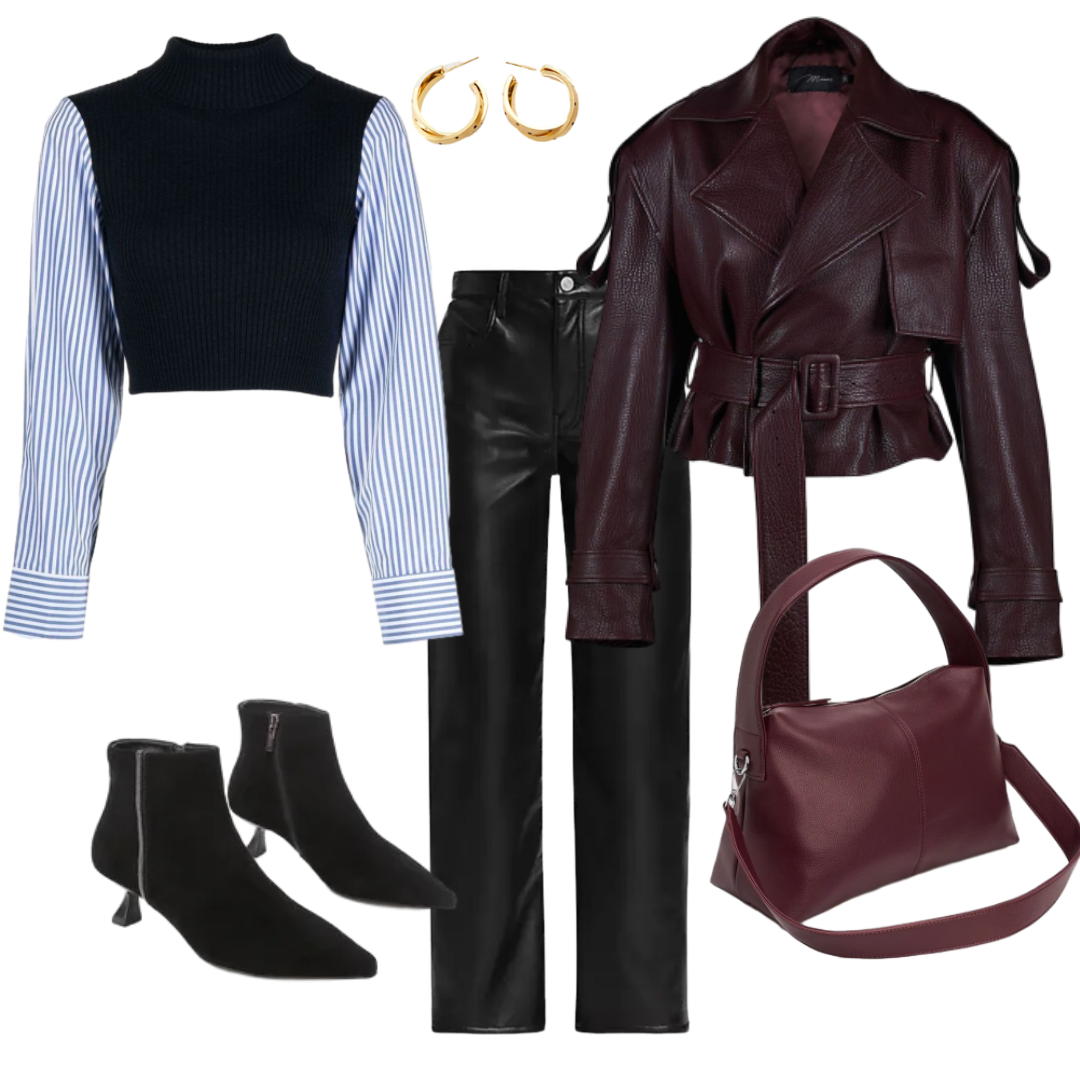 Кожаная куртка - безусловный маст-хэв весеннего гардероба, который легко адаптируется под любой сценарий: от расслабленных повседневных образов до выверенных деловых сочетаний. В этой подборке — 12 продуманных комплектов, где она становится ключевым акцентом. Каждый из них — про баланс, актуальность и внимание к деталям. Остаётся лишь выбрать свой и вписать его в ритм своего дня. Лаконичный комплект с акцентом на чёткий силуэт. Укороченный джемпер идеально работает в паре с курткой, не нарушая линию талии, а чёрные ботильоны в тон брюк визуально вытягивают силуэт. Оливковая кожаная куртка здесь играет роль яркого акцента. Голубая водолазка и светлые джинсы - освежающая база. Черная сумка с крокодиловым тиснением добавляет фактурности, а кеды делают образ комфортным и непринужденным. Коричневая укороченная кожанка придает образу теплоты и уюта. Туфли с принтом под змею и сумка в тон куртки создают стильный и продуманный ансамбль, который подойдет для офиса и вечерних мероприятий. Кл