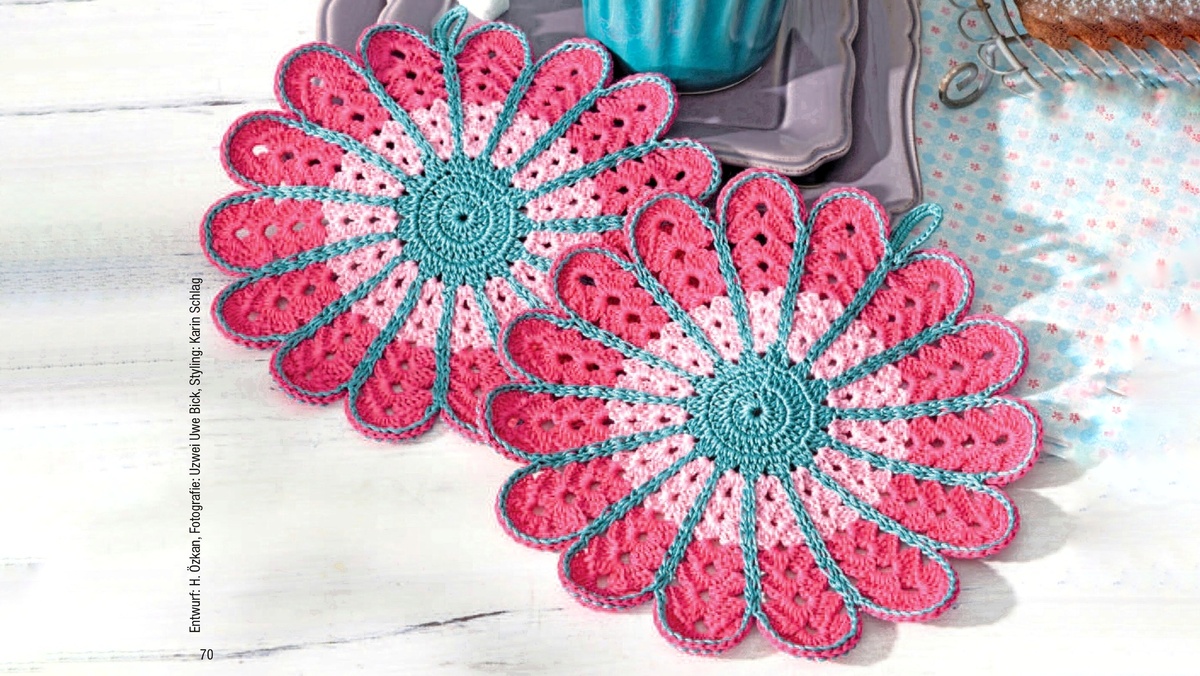 Следующая прихватка уже более интересная. Она в виде цветка с лепесточками. Выглядит очень красиво.