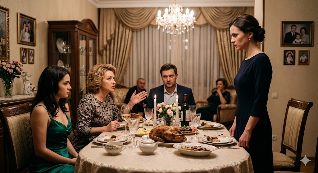 Квартира свекрови сияла чистотой. На столе хрусталь, в духовке томится гусь. За столом уже сидели Антон, светящийся от самодовольства, Тамара Ильинична в бархатном платье и, конечно же, Милана, которая не упускала случая вкусно поесть за чужой счет.