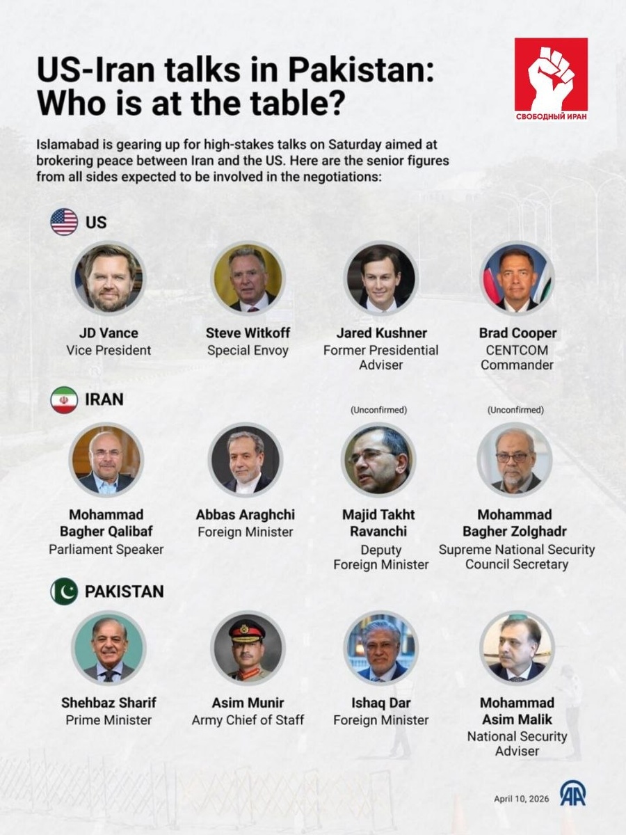 🇺🇸🇮🇷🛑 Турецкое агентство Anadolu опубликовало новый список участников встречи США и Ирана в Исламабаде: от Вашингтона — Вэнс, Уиткофф, Кушнер и глава CENTCOM Купер; от Тегерана — Арагчи, Галибаф, Тахт-Раванчи и Зольгадр; от Пакистана — Шариф, Мунир, Исхак Дар и Малик. Подпишитесь на канал