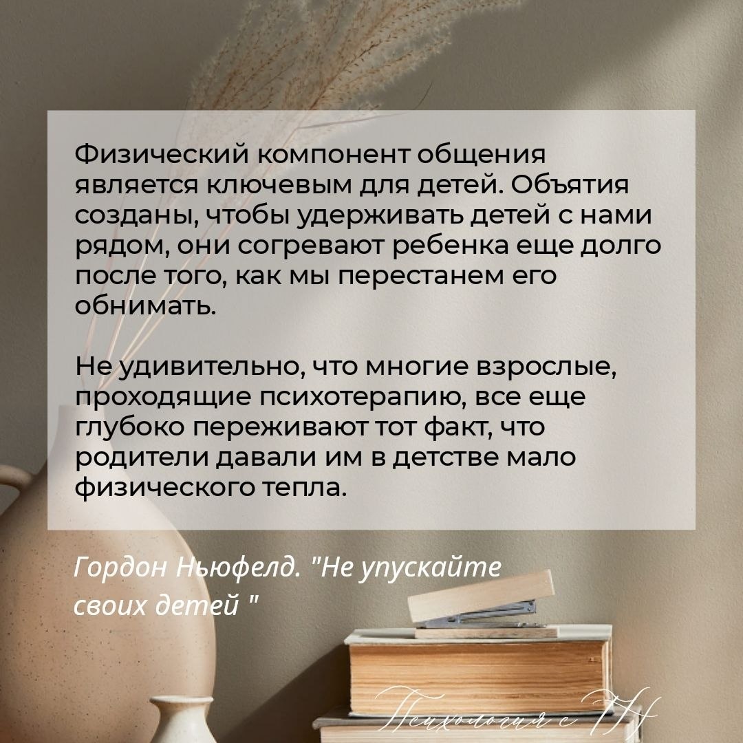 Цитата любимого учителя Гордона Ньюфелда. Вспомните, как много объятий получает младенец и как мало подросток, особенно мальчики! Но объятия – это необязательно целовать ножки, это может быть лёгкое движение по плечу, просто обнимашки при встрече, просмотр кино прижавшись друг к другу. Поцелуй в макушку или в нос. Нет, здесь нет инцестуального подтекста. ❤️❤️❤️ А как же важны объятия взрослым! Как давно вы обнимались с любимым человеком? Держались за руку? Вот просто с теплотой...