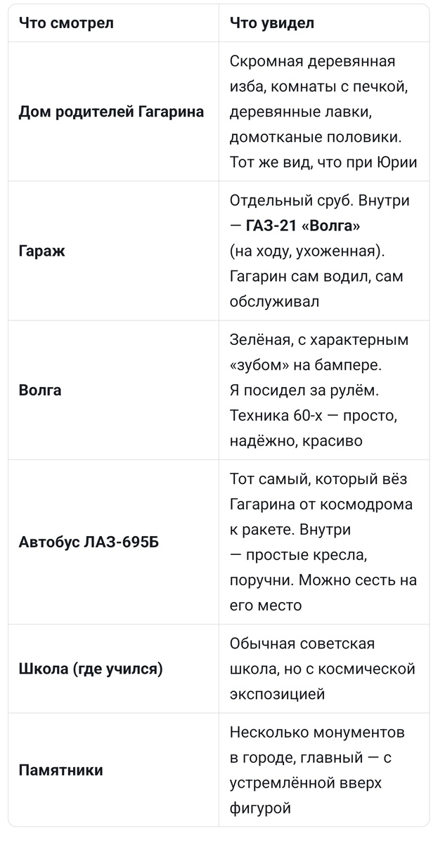 Что в статье? - Живой текст о человеке, который изменил мир. Факты, эмоции, кадры из города Гагарина и редкие цитаты. Я, Дмитрий НЕдиванный, съездил в город, где родился и вырос первый космонавт Земли. Увидел его дом, его гараж, его «Волгу» и тот самый автобус, который вёз его к старту. Это не сухой пересказ из учебника. Это попытка понять: как обычный человек решился на невозможное? Некоторые люди живут долго и не оставляют следа. А Юрий Алексеевич прожил всего 34 года — и изменил историю навсегда. В 1959 году в СССР набирали первый отряд космонавтов. Правила были простые: лётчик-истребитель, возраст до 30, рост — не больше 170 см (чтобы влезть в капсулу), вес — до 72 кг. Идеальный кандидат должен был быть спокойным, выносливым, с железными нервами и желательно с улыбкой. Из трёх тысяч лётчиков отобрали двадцать. Из двадцати — шестёрку. Из шестёрки — одного. После приземления его мгновенно превратился в легенду. Он объездил десятки стран, его узнавали в лицо на всех континентах. А чер