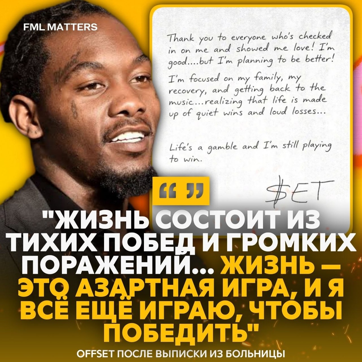 🙏 OFFSET ВЫПИСАЛИ ИЗ БОЛЬНИЦЫ! После выписки рэпер обратился к фанатам в соцсетях и поблагодарил всех за поддержку, заявив, что с ним всё в порядке, и он собирается стать ещё сильнее. По его словам, сейчас он сосредоточен на семье, восстановлении и возвращении к музыке. 💀 FML MATTERS