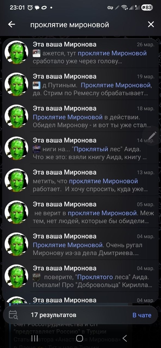 Носиков поддержал Миронову, его теперь хотят признать иноагентом... Ремесло встретился с ней в суде и уехал в дурку... Губарев тоже поддерживал Миронову, и дал Дудю... На её прошлом рабочем месте в Новой Газете идут обыски... Проклятие Мироновой - опасная штука, друзья. 😁